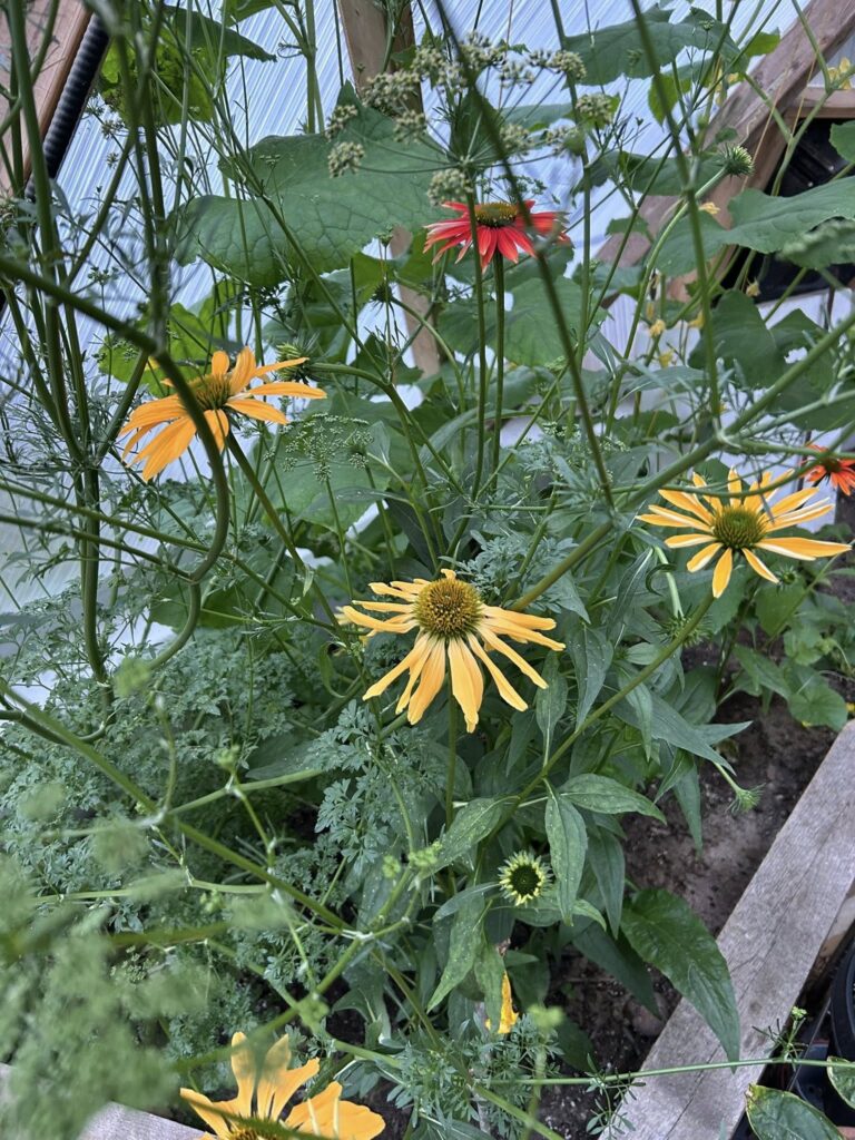 - Late season (September–October): Rudbeckia, late cosmos, agastache, marjoram seed heads