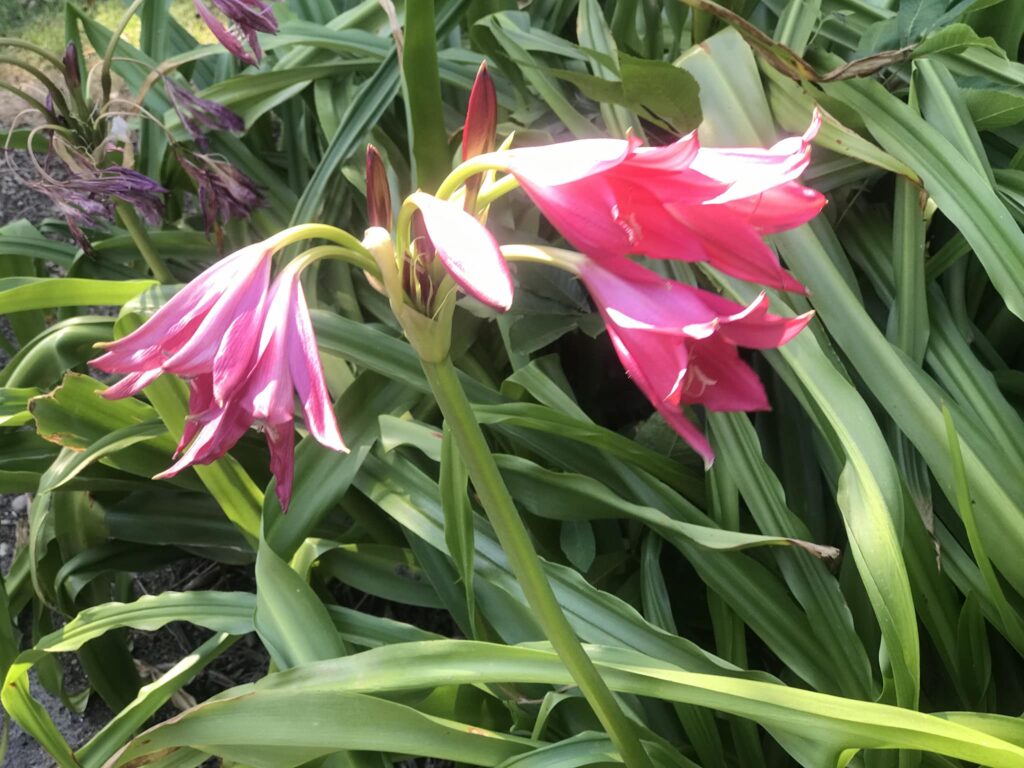 What they look like: The flowers are large trumpets — similar in shape to amaryllis blooms — with six long, sweeping petals in white, pink, or striped combinations. They are held in clusters of four to ten blooms at the top of thick, leafless stems. The fragrance of many crinum species is exceptional — rich, sweet, and pervasive on warm evenings.