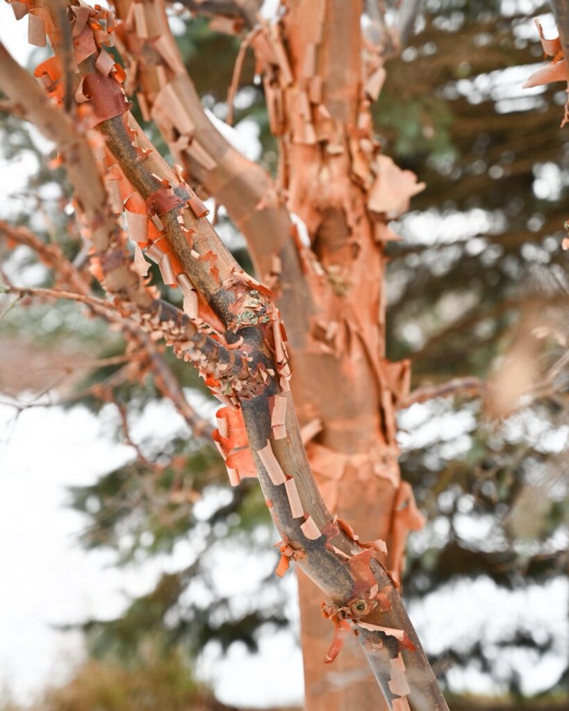 The tree’s most celebrated feature is its bark. As the tree matures, the outer bark peels away in thin, papery curls, exposing layers of warm cinnamon, copper, and mahogany underneath.