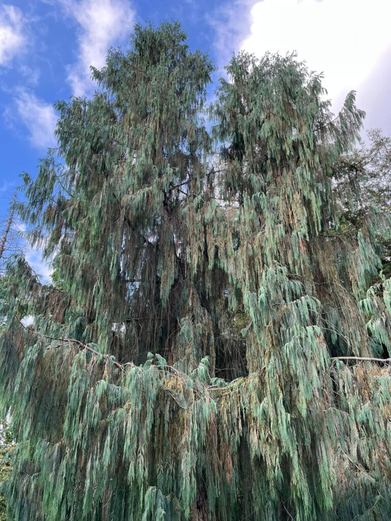 Widely considered the most beautiful cypress species in the world, the Kashmir cypress is native to Bhutan and parts of northeastern India, where it grows in Buddhist monasteries and sacred groves. Its long, blue-grey branchlets hang in sweeping, curtain-like cascades from arching branches — a weeping habit of extraordinary elegance.