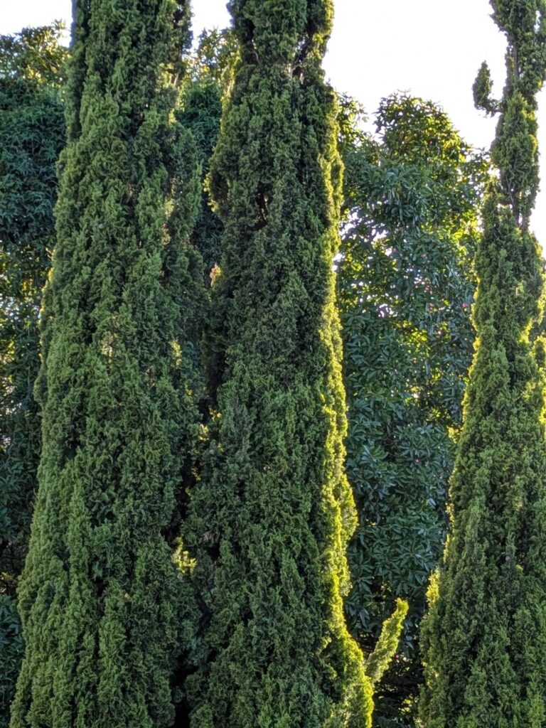 Perhaps the most recognisable cypress in the world. The Italian cypress grows in a tight, narrow column — almost like a dark green exclamation point rising from the landscape. Native to the eastern Mediterranean and western Asia, it has been cultivated in Europe for thousands of years.