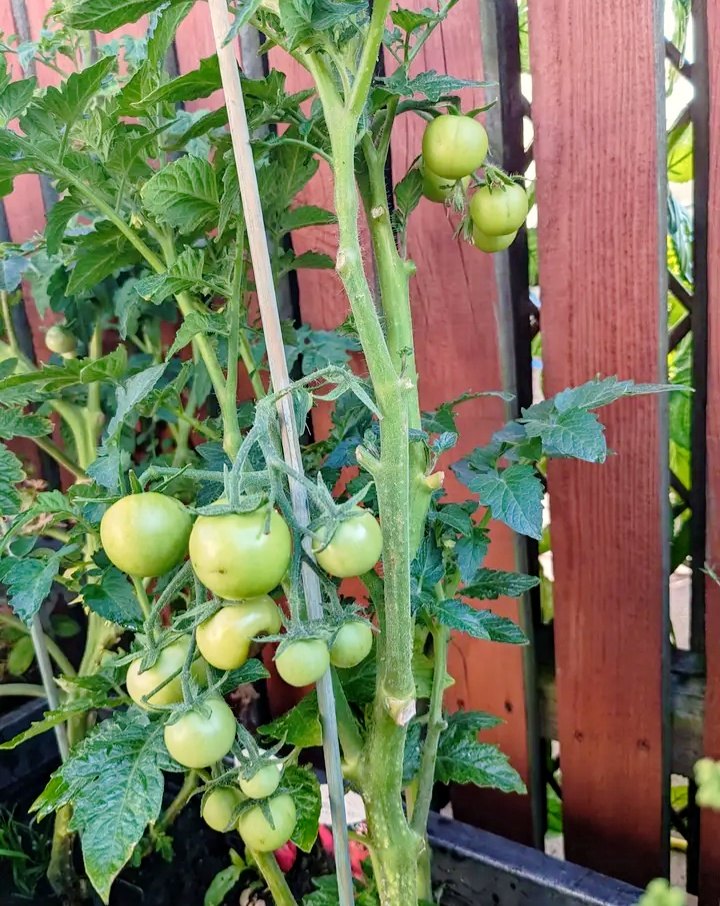 - Use a support structure like a cage or stake early on — tomato plants get heavy with fruit.